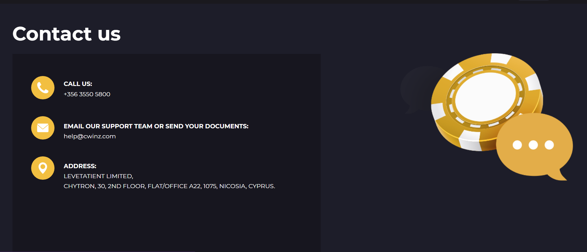 プラットフォームはオンラインゲームを提供しています。メンバーは、ゲーム中にソリューションを取得するために、ライブチャットすることができます。しかし、C winzの顧客が利用可能な他のオプションがあります。help@cwinz.com、プレーヤーが窮地に立たされることがないように、電子メールアドレスも用意されています。ただし、返答が遅くなる可能性があることを指摘しておく。C winzのインターネットユーザーは、356 3550 5800のプラットフォームに連絡することもできます。